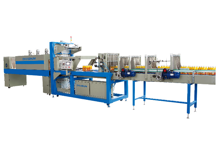 進料輸送機構連接生產線,分包機構按包裝規格分組,撥桿機構配合輸送,在運行中自動整形,運行中自動套膜封切,自動完成熱收縮及冷卻工藝。